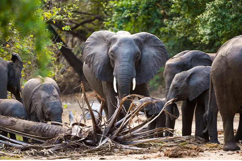 Die Tierwelt umfasst eine große Anzahl von Elefanten, und der Fluss lockt unzählige Flusspferde und Krokodile an. Löwen und Geparde wurden kürzlich in Liwonde wieder angesiedelt. Zu den Antilopen gehören Kudu, Rappen und Buschbock. Leoparden, Hyänen und Spitzmaulnashörner werden ebenfalls gelegentlich gesichtet. Die Vogelwelt ist außergewöhnlich vielfältig. Der Fluss lockt Fischadler an, und Webervögel bauen ihre Nester im Gehölz. Pel’s fishing owl is often seen at dusk along the river’s edge.
