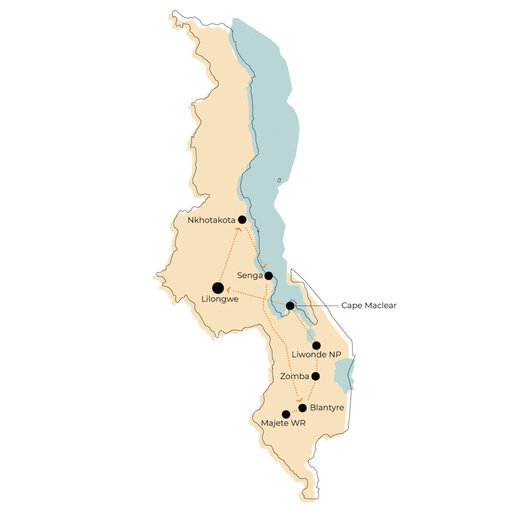 Sie beginnen dieses Abenteuer in Malawis Hauptstadt Lilongwe. Von dort aus fahren Sie zum Nkhotakota Wildlife Reserve, dem ältesten Wildreservat Malawis. Nach einer ersten Begegnung mit dem Malawisee, fahren Sie weiter zum nächsten Wildreservat, dem Majete Wildlife Reserve. Durch das grüne Zomba-Plateau fahren Sie in den berühmten Liwonde-Nationalpark, wo Sie die Qual der Wahl zwischen einer Vielzahl von Wildtieren haben werden. Letzter Halt ist Cape Maclear, wo Sie die Reise am Strand des Malawisees entspannt ausklingen lassen.